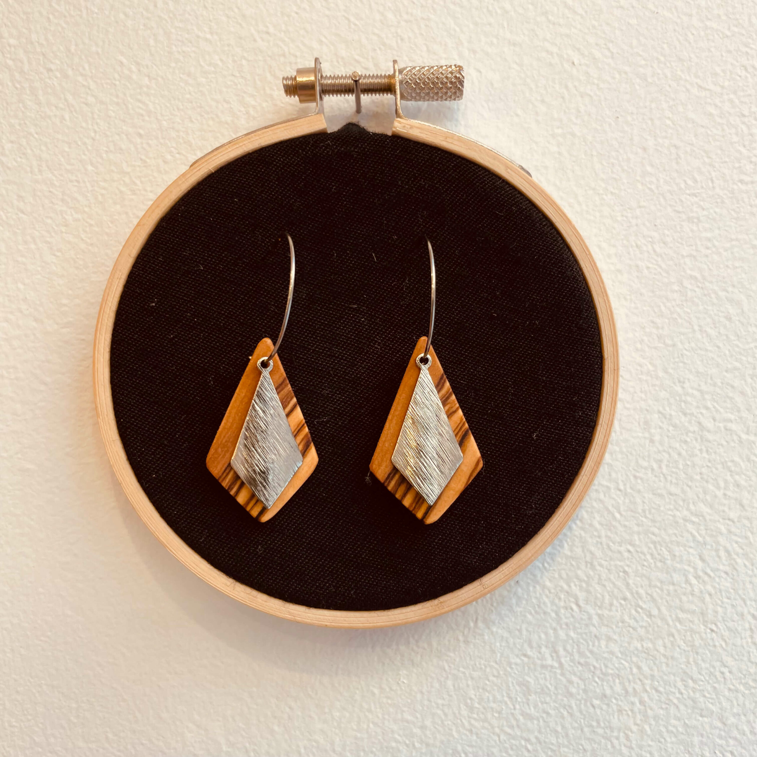 Un bijou artisanal en bois: graphique, unique et naturel.